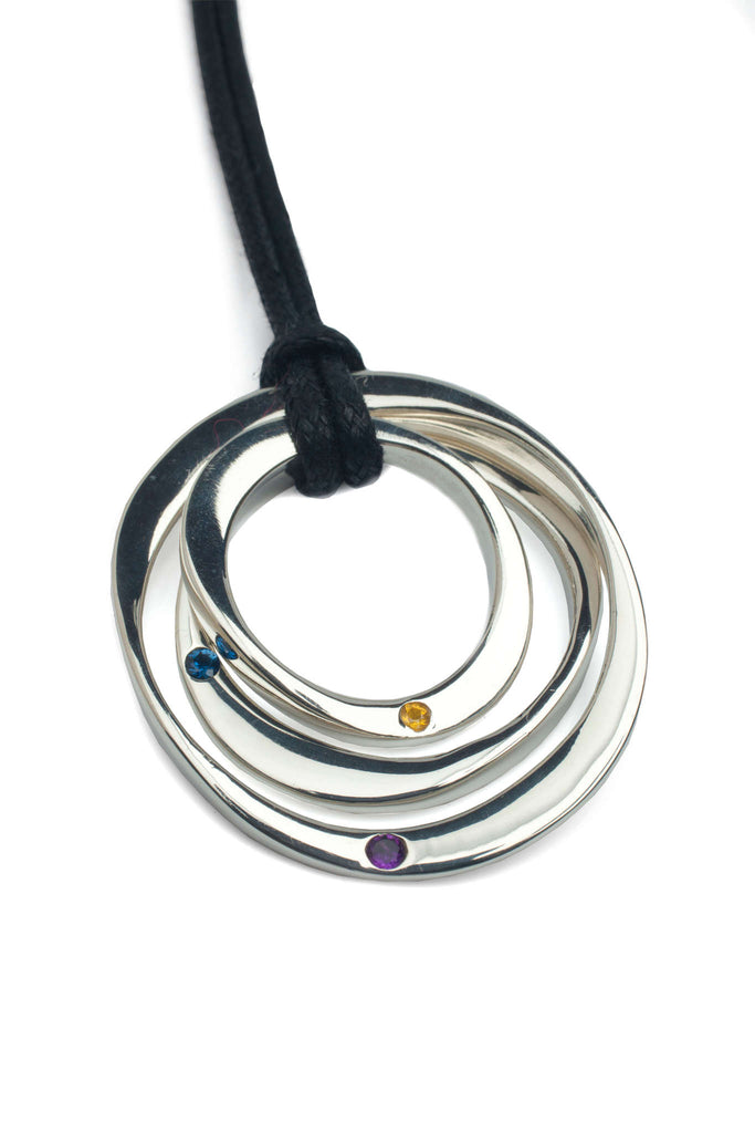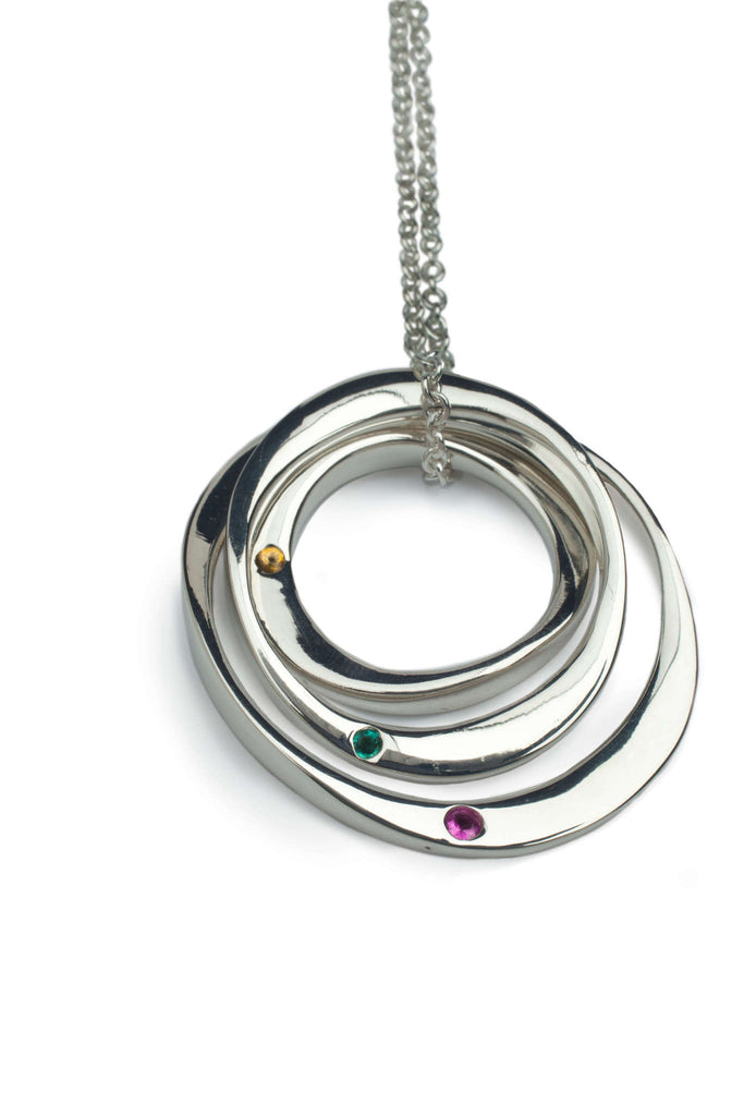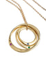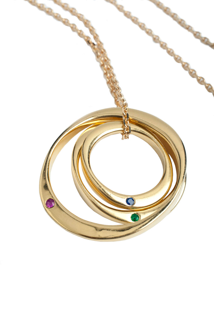 Our iconic three ring necklace with gemstones in solid 9ct Gold. Designed and handmade in London, a feminine yet classical interpretation of the infinity circle.