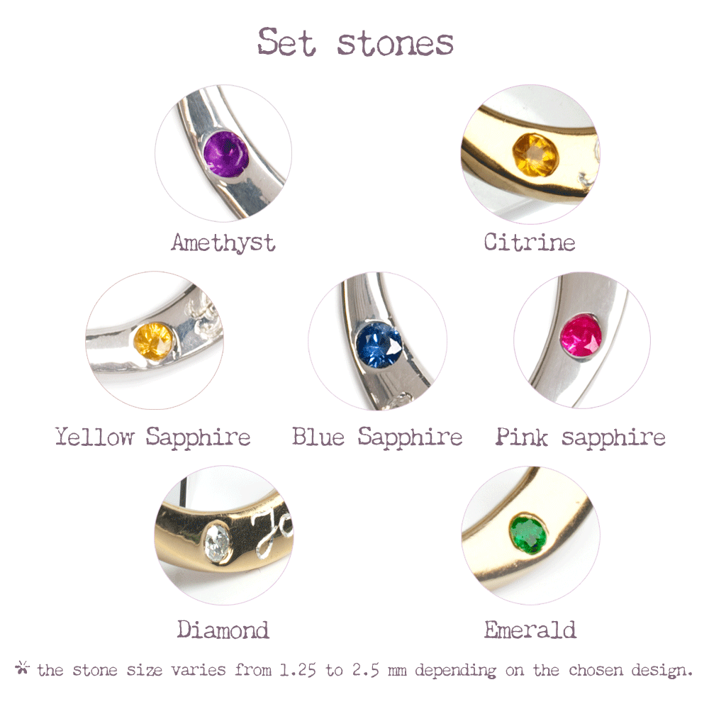 This timless design comes in either Yellow, White or Rose 9ct gold. The addition of set stones is the ultimate personalisation. You can choose among : amethyst, citrine, yellow, blue or pink sapphire, diamond or emerald and create your truly bespoke harmony.