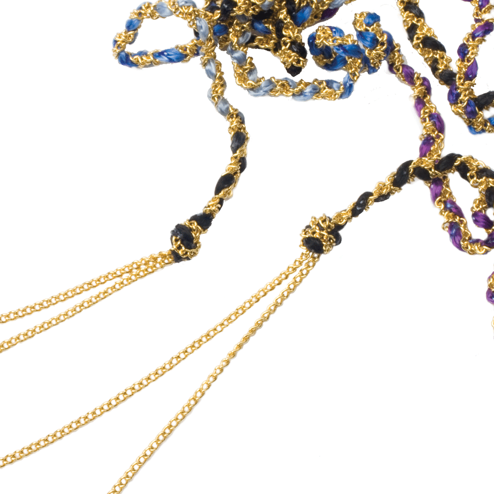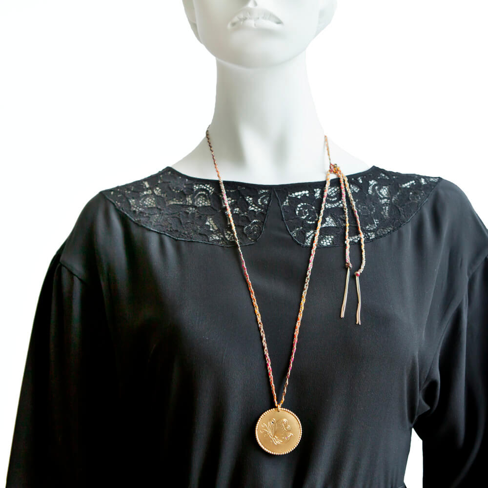 Wear on a long 90cm gold long chain or for a more sophisticated style on a silver and gold plated braided chain with coloured yards (choice of 2 colour harmonies : blue,purple and black or black yard).