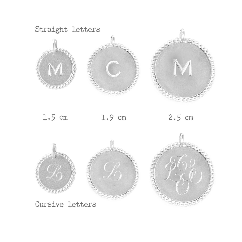 A monogram (up to 6 initials) can be engraved at the front of the medal. We suggest engraving the family initials (husband, wife and children). We will carefully choose the nicest layout to make it stand out. You can also have names or a personalised message (up to 40 characters, upper and/or lower case) engraved around the edges of the disc. This is optional. Alternatively you can choose to purchase the piece with the message shown on the pictures (Joy. Communion. Harmony. Wisdom. Faith. Kindness).