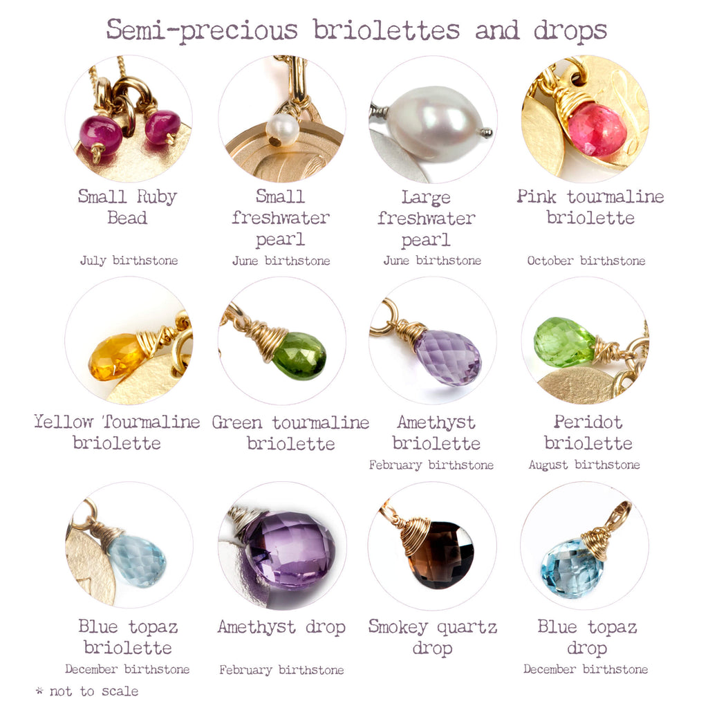 For the ultimate finishing touch, add one or two semi-precious stones or pearls (from our selection of 13 : Small ruby bead; small or large freswater pearl; pink, yellow or green tourmaline briolette; amethyst, peridot or blue topaz briolette; amethyst, smokey quartz or blue topaz drop and rough emerald bead). Please note that the emerald beads will be smaller than on the images.
